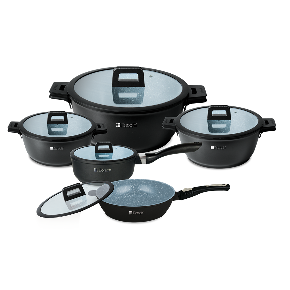 طقم اواني طبخ 5 قطع غطاء مسطح مع حرف الغطاء من السليكون طنجرة – (20 سم + 24 سم + 28 سم ) كاسروله 18 سم مقلاة غميقه مع غطاء – 28 سم